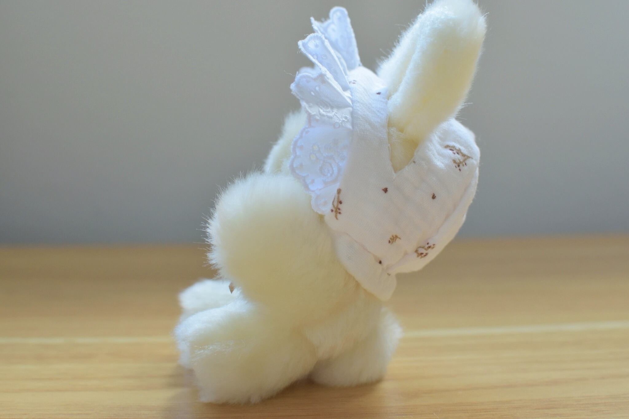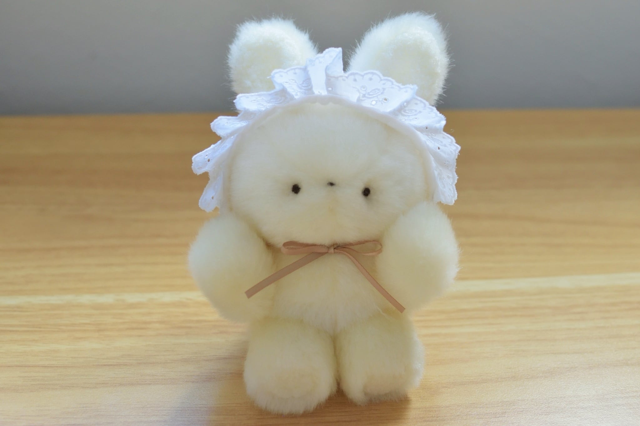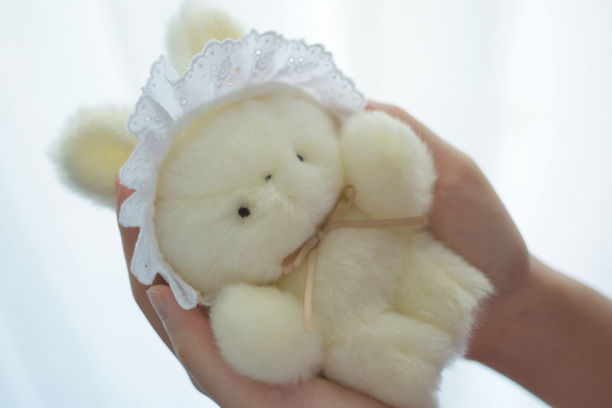 ベビーボンネットを着けたアイボリーカラーのうさぎです