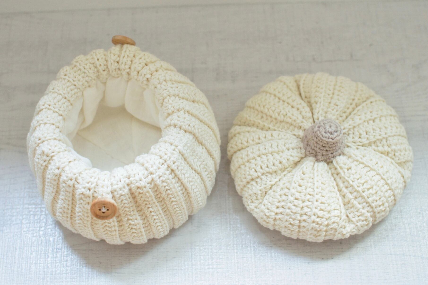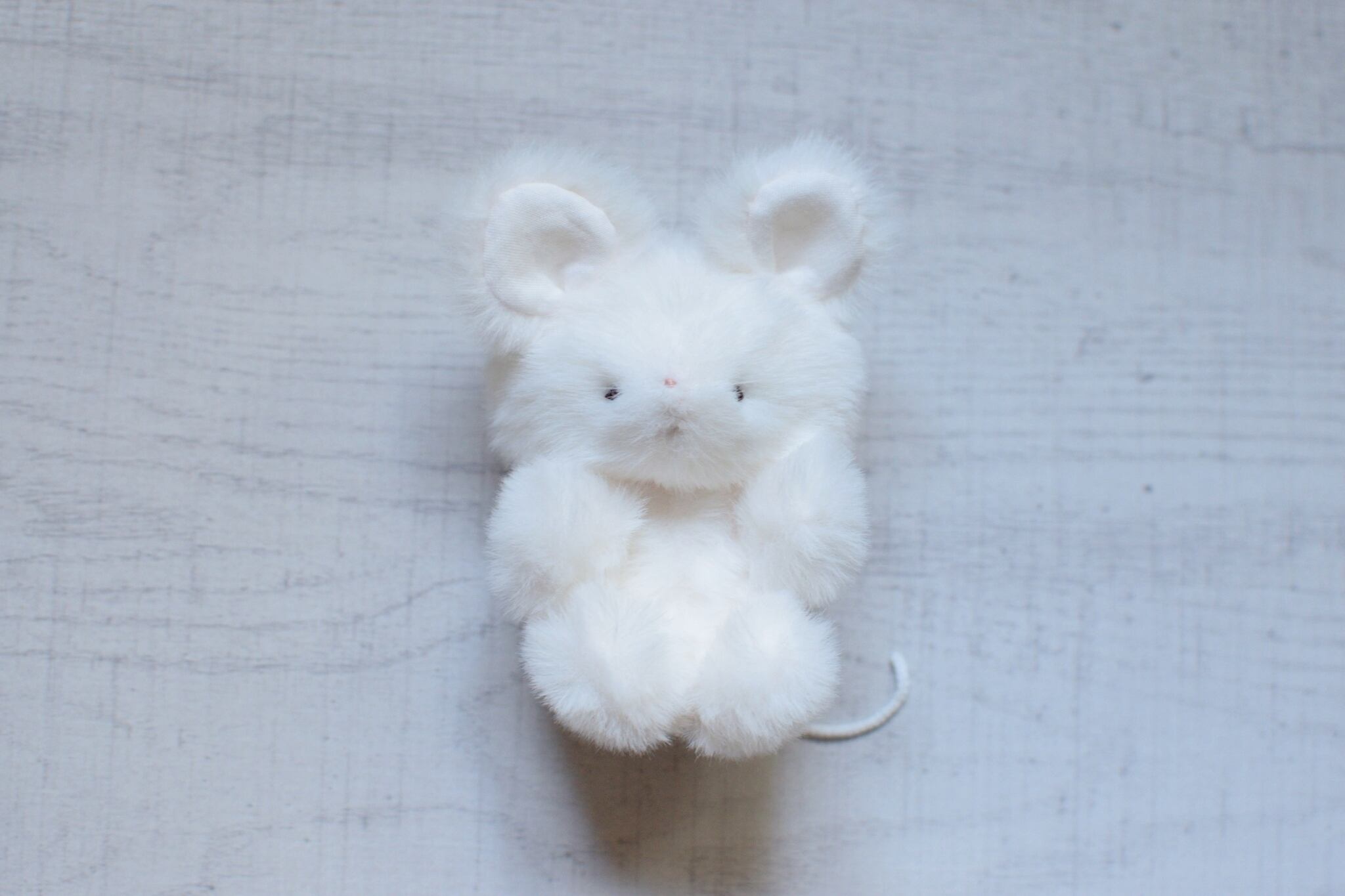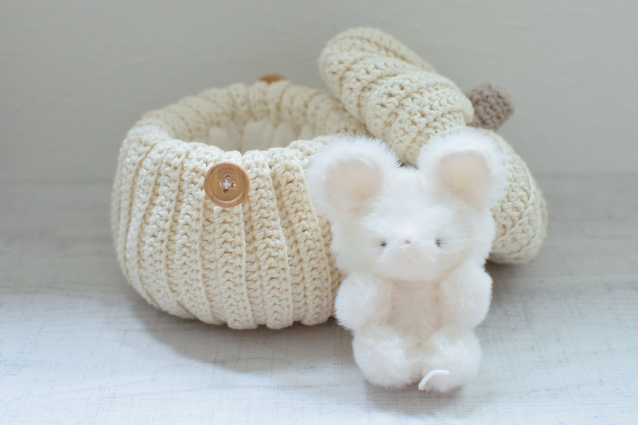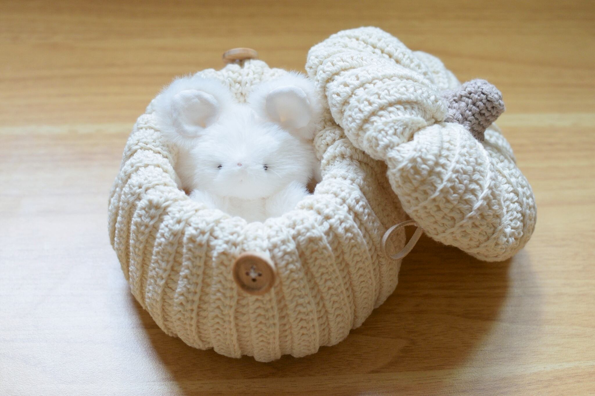 白いカボチャの入れ物に隠れたこねずみのぬいぐるみです
