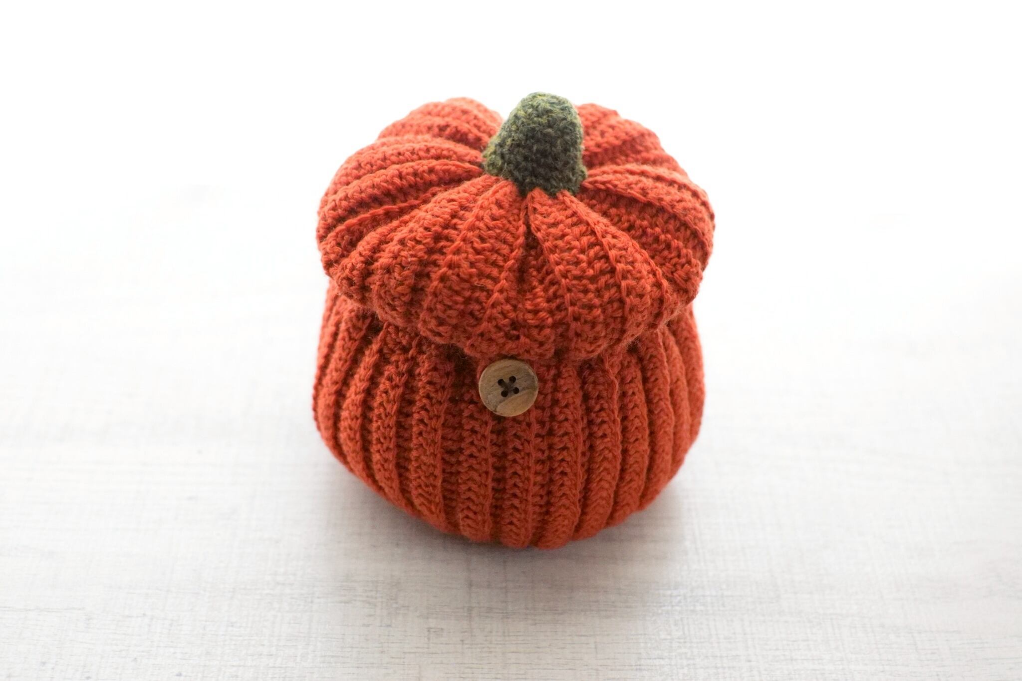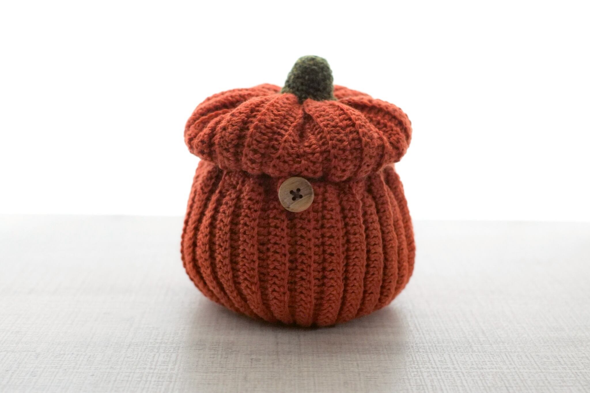オレンジカボチャの入れ物に隠れたこねずみのぬいぐるみです