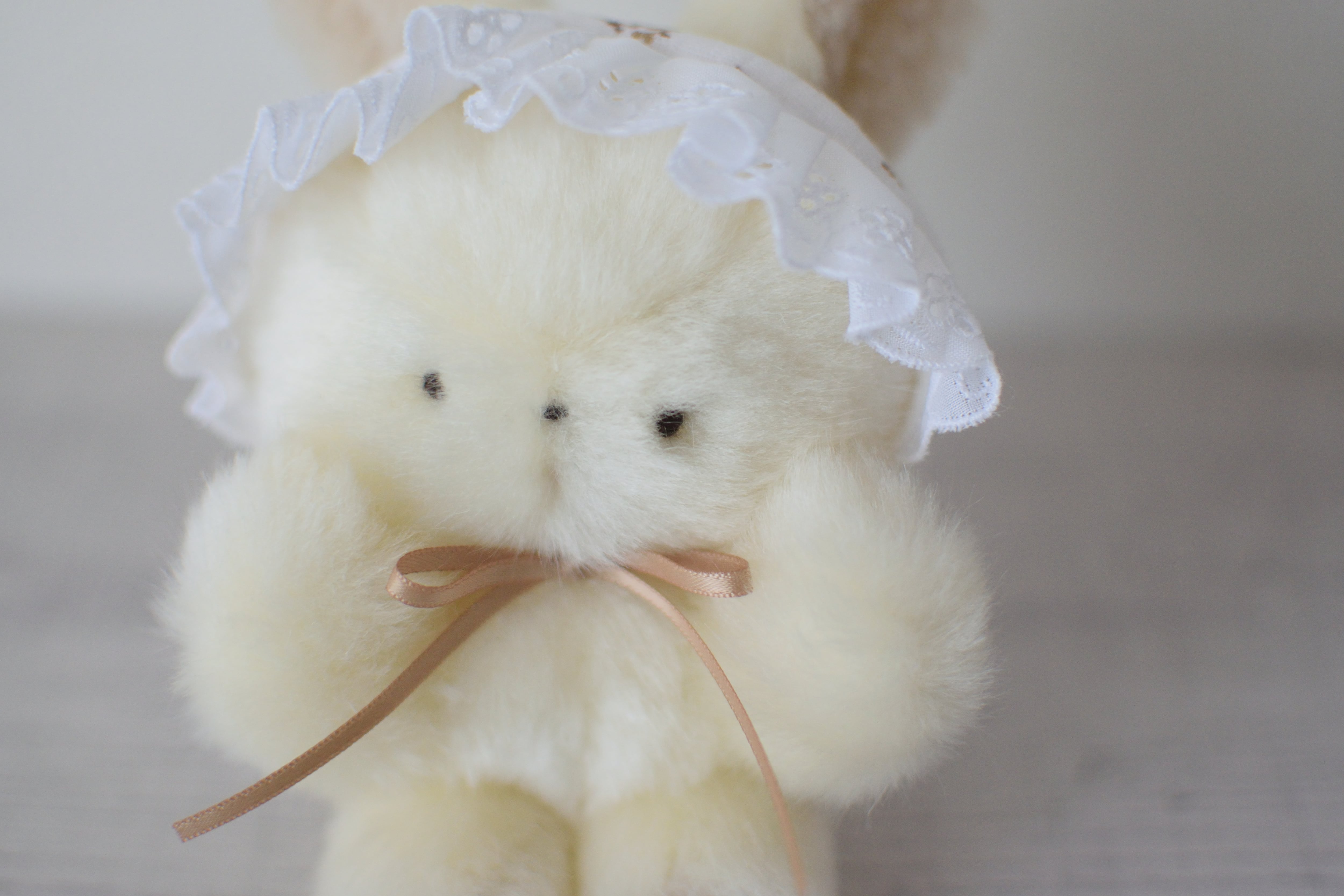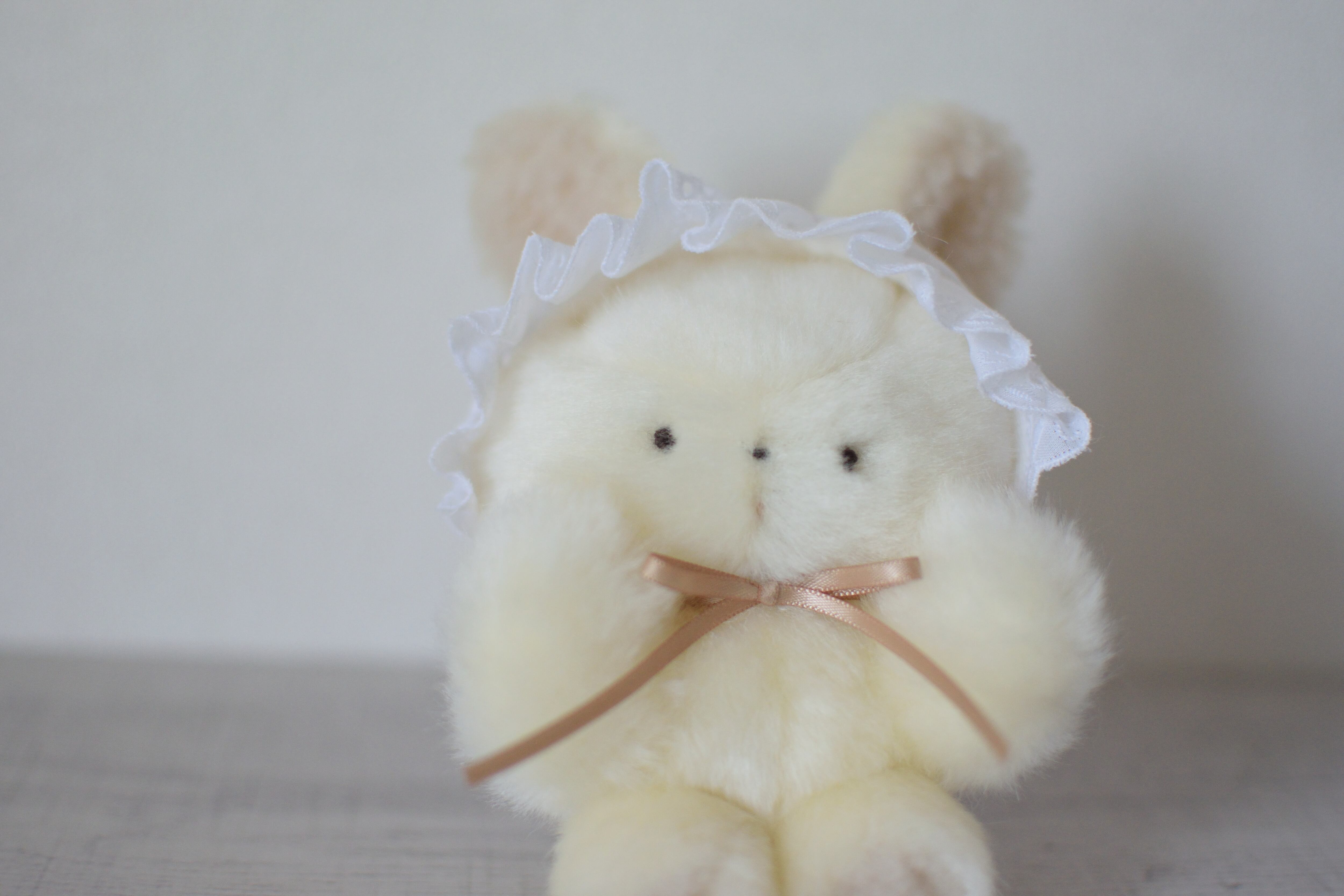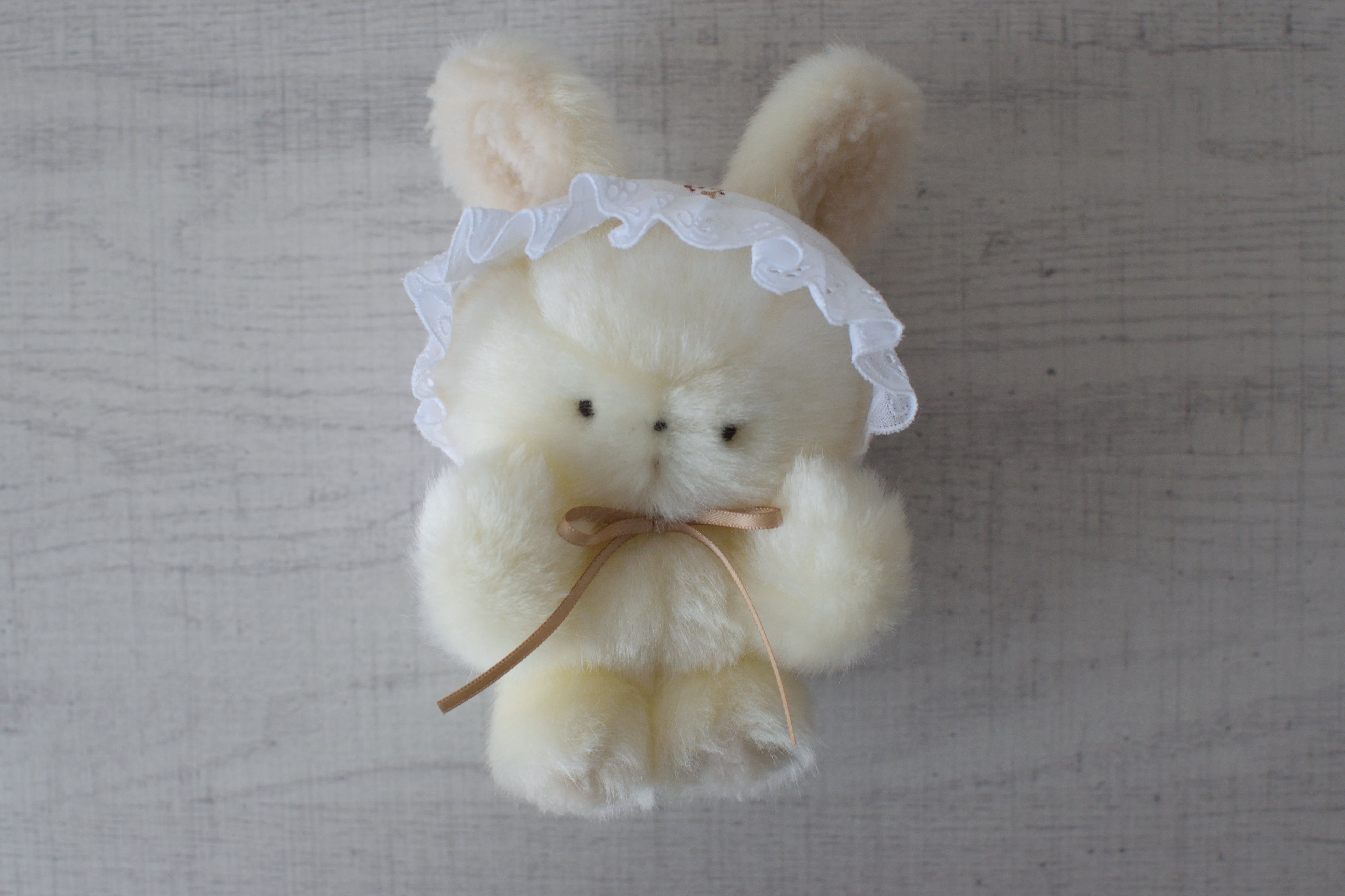 白地の花柄のベビーボンネットを着けたアイボリーカラーのうさぎです