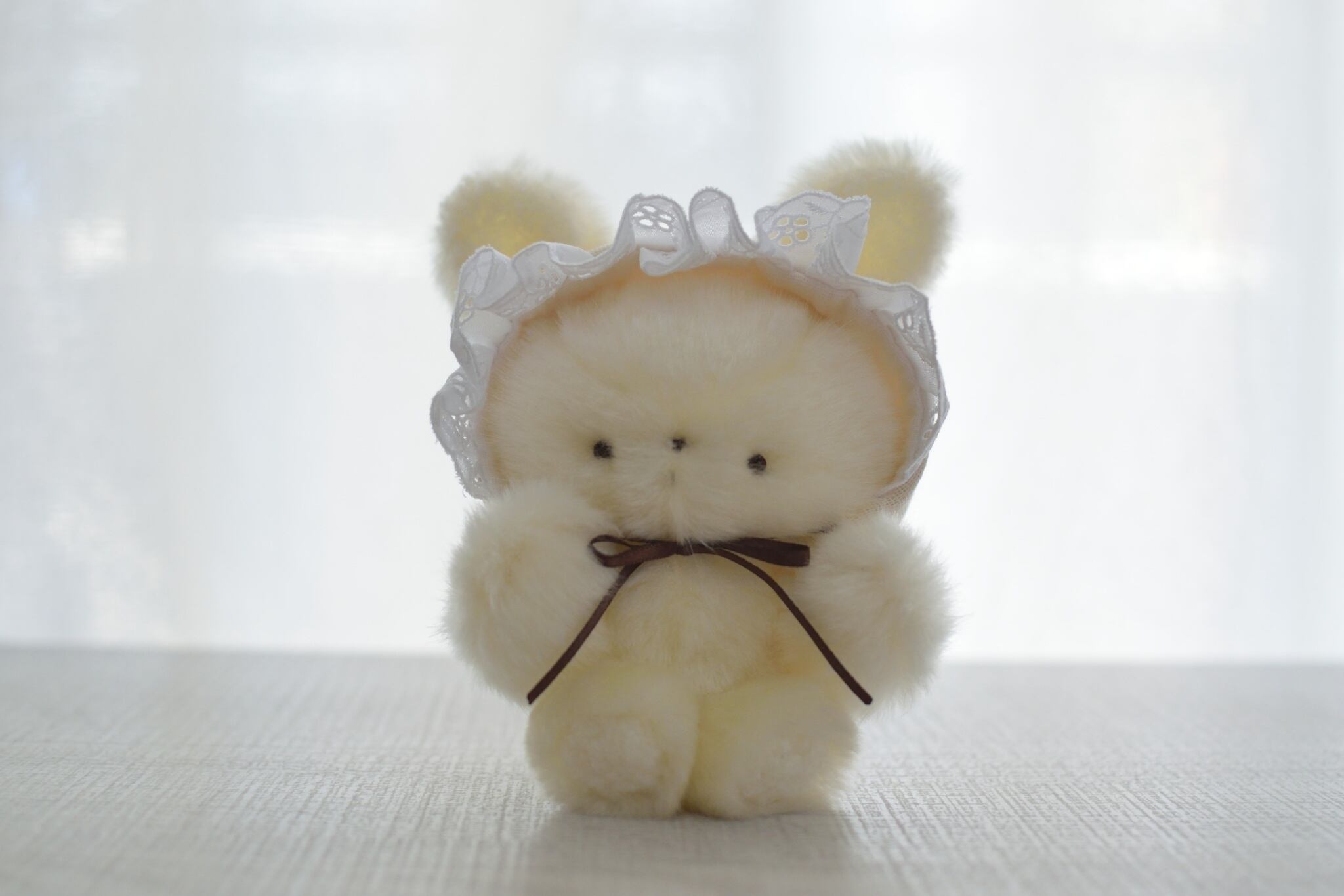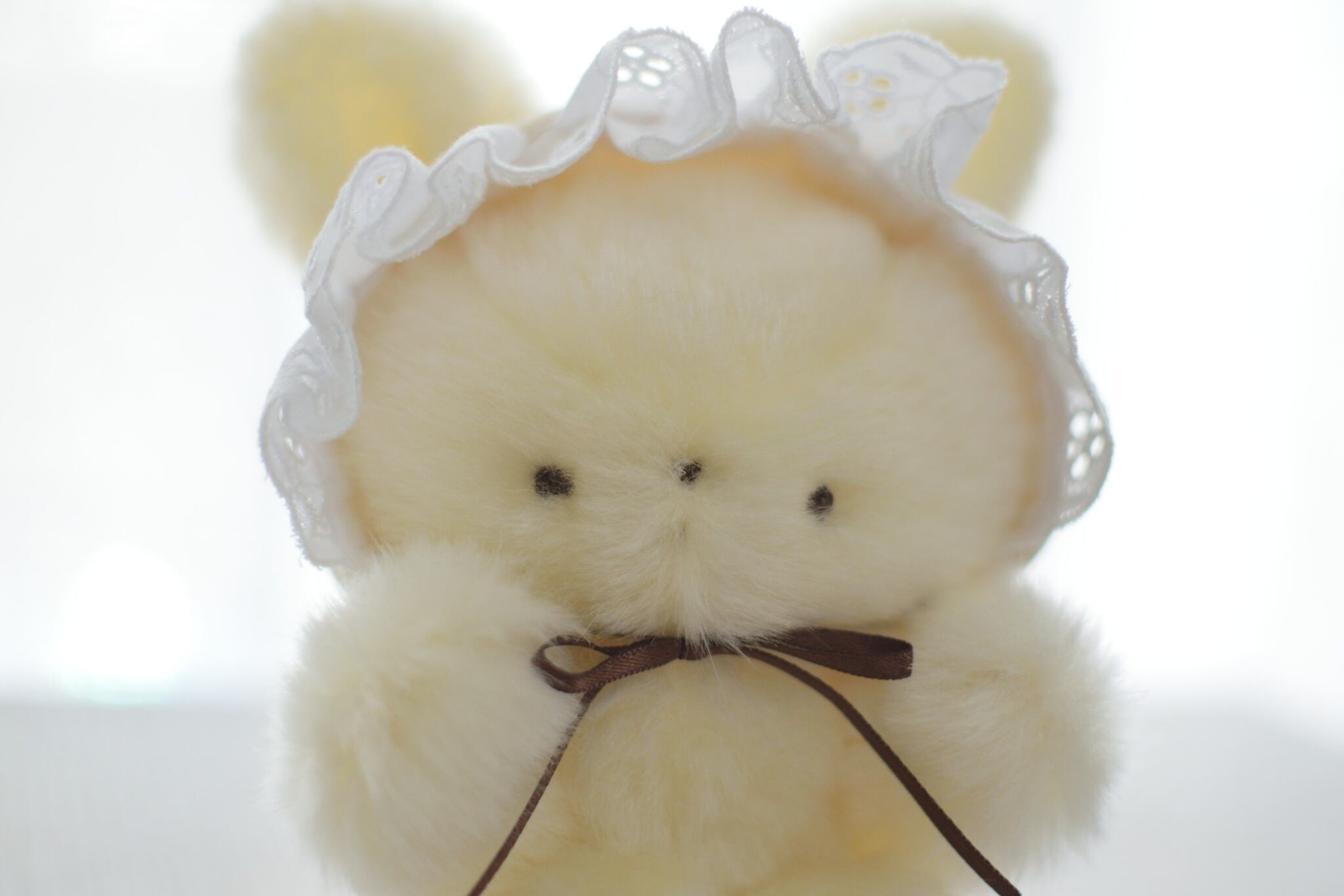 ベビーボンネットを着けたアイボリーカラーのうさぎです